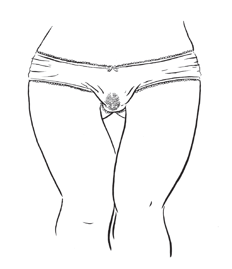 Pumpiloj kaj kalsonoj en pala rozkolora sateno kun malseka aŭreolo en la strategia loko. “Ĉi tio estas mia Halloween-kostumo,” ŝi diras al mi – kaj mi supozas, ke ŝi nur diras tion al mi, por ke mi povu gustumi la dolĉaĵon.